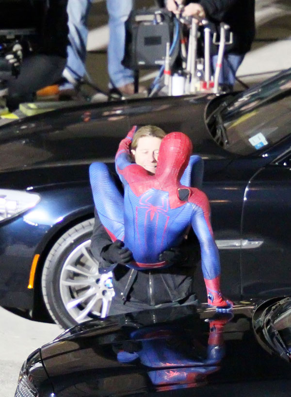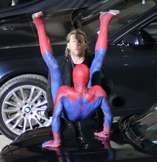 Los chicos de Vas Tú Listo hemos enviado a una de nuestras reporteras buenorras para que siga de cerca el rodaje de la nueva película del hombre arácnido. Para los que no lo sepan, Marvel quiere darle un nuevo lavado de cara a las películas de nuestro superhéroe favorito reiniciando de nuevo la historia desde el principio y basándose en la línea argumental de la saga Ultimate Spiderman. La nueva saga se estrenará en el 2012, y su director ya no será Sam Raimi, sino Marc Webb, y el actor que llevará el traje del trepamuros será Andrew Garfield. Pues bien, nuestra reportera nos ha traído unas fotos del rodaje donde da la sensación que están rodando la versión gay de Spiderman. ¿No te lo crees? ¡Pues mira!